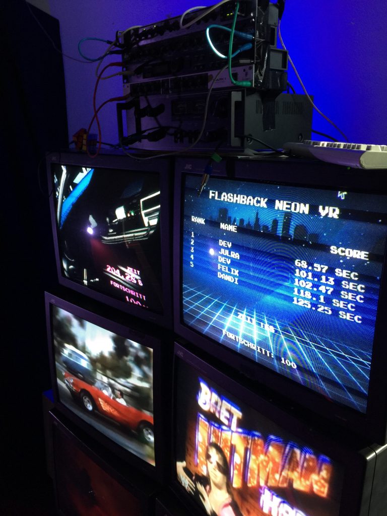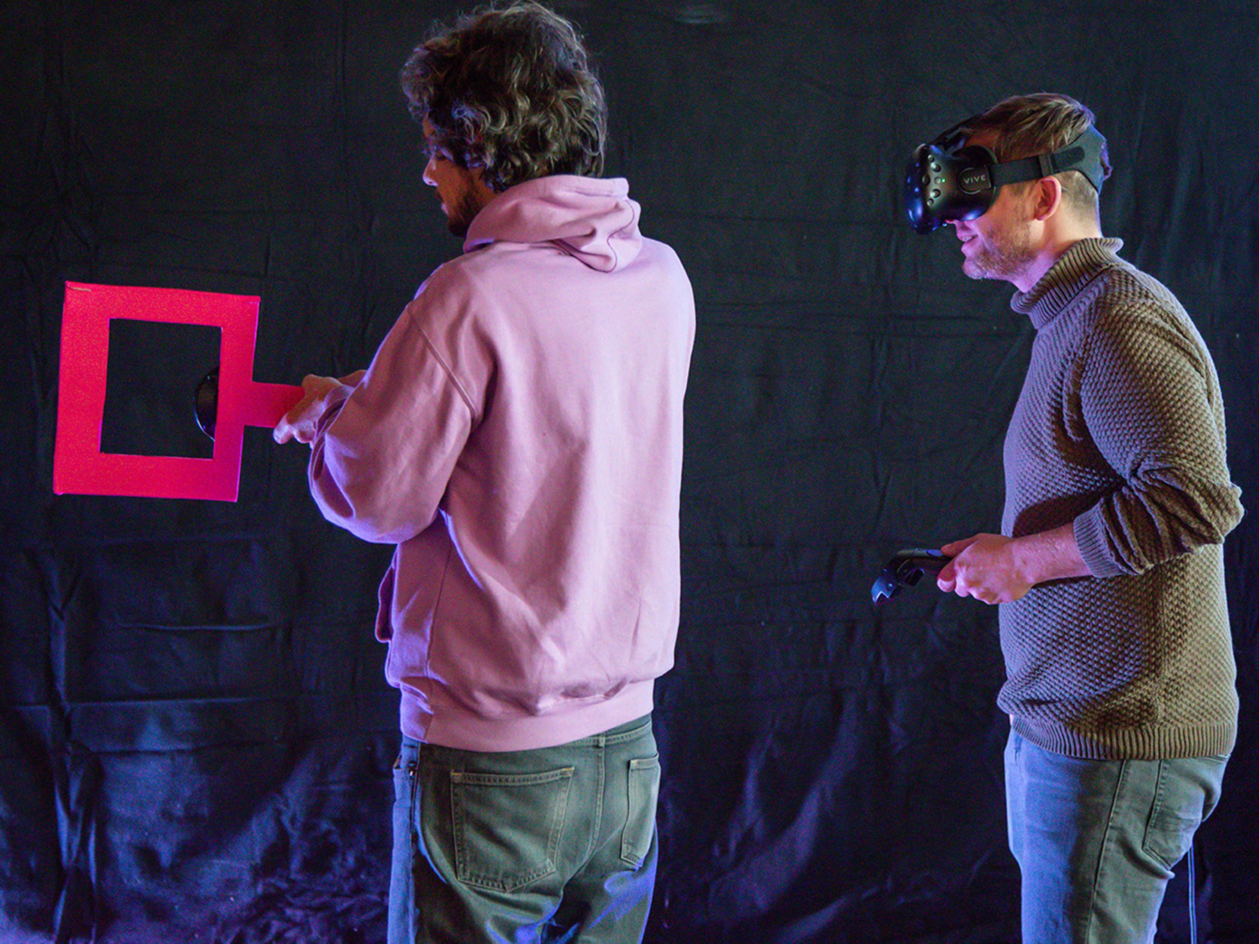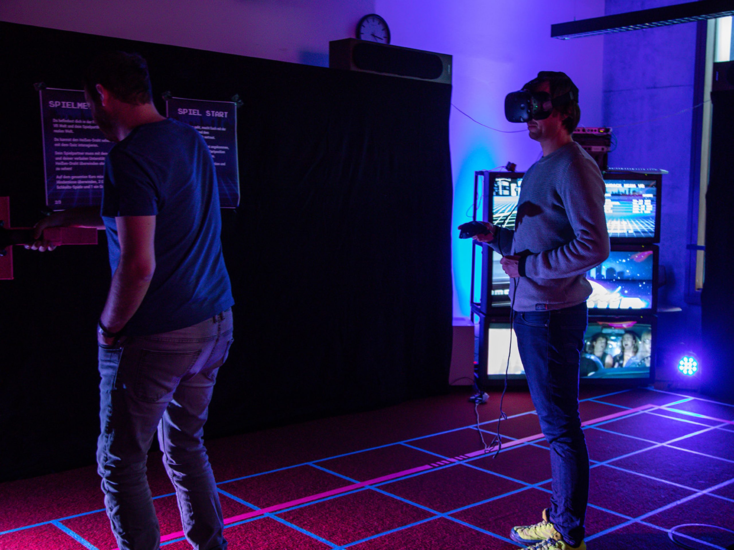 The users are abducted into a spectacular virtual world whose aesthetics correspond to the 80s and early 90s. Played is „The Hot Wire“. However, the seeing person (VR glasses) is in the VR world and the controlling person (motion controller) is in the real world. So the main task is to overcome the distance of the „hot wire“ by purely verbal communication. The two players have to agree on route and direction commands within the shortest possible time to complete the game as quickly as possible. If the wire is touched, the team gets 3 penalty seconds. During the game, the teams meet additional tasks and obstacles in the form of skill exercises and a quiz.