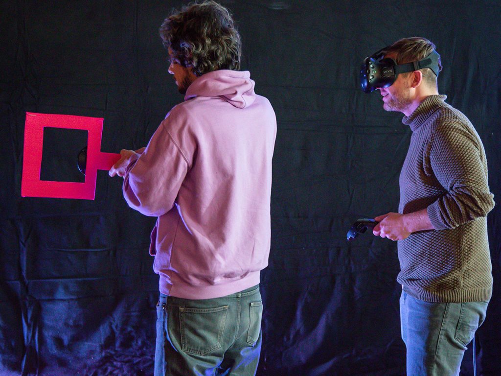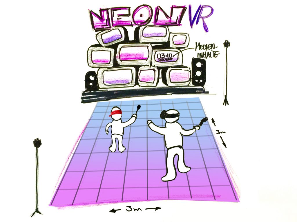 Flashback Neon VR stands for fun in two completely different worlds. The installation, which takes place simultaneously in three-dimensional virtual space and in the real world, connects two players to form a team.